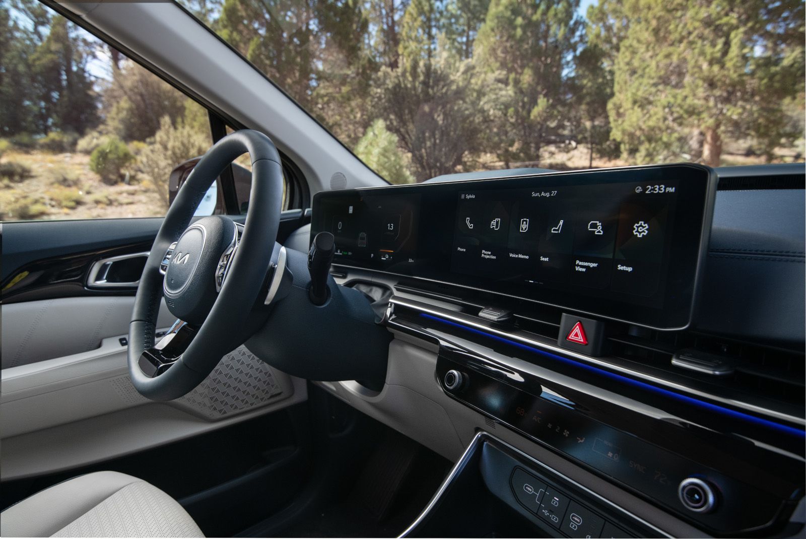 The Carnival HEV provides similar technology features, including Digital Key, wireless phone charging, a full display digital rear-view mirror with HomeLink, and a 110V inverter. The available Bose premium audio system delivers premium sound quality throughout the cabin. A heads-up display system is available on the SX trim. The Blind-Spot View Monitor and Surround View Monitor enhance safety during daily driving.